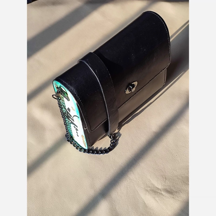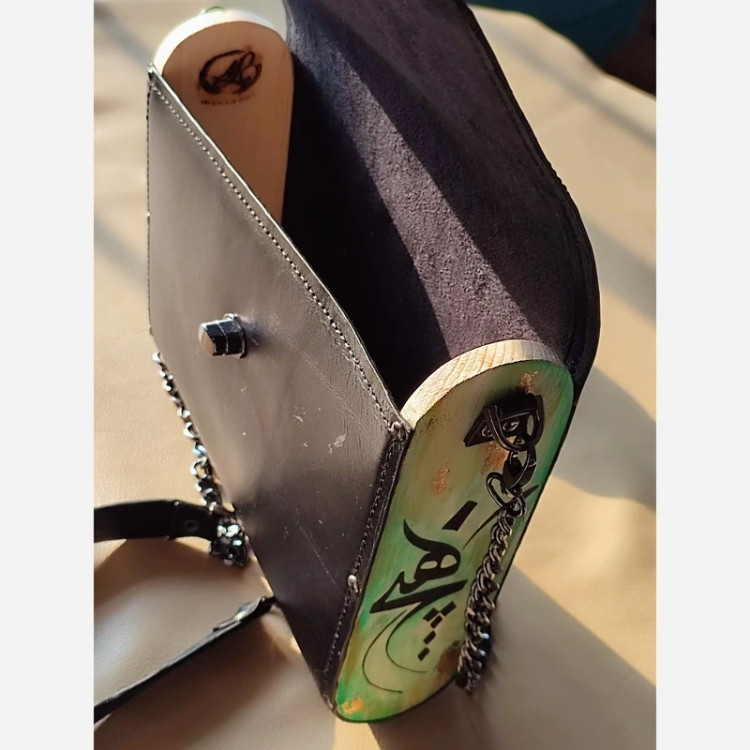 کیف رودوشی زنانه طرح هیچ سما چرم طبیعی گاوی درجه یک تماما دستدوز است که در کناره کیف از چوب نراد طراحی شده توسط تیم چرم خلاق استفاده شده که روی چوب ها نقاشی دست با رنگ آکرولیک کار شده و تمامی چوب ها دارای پوشش نانو ضد آب و خش است.