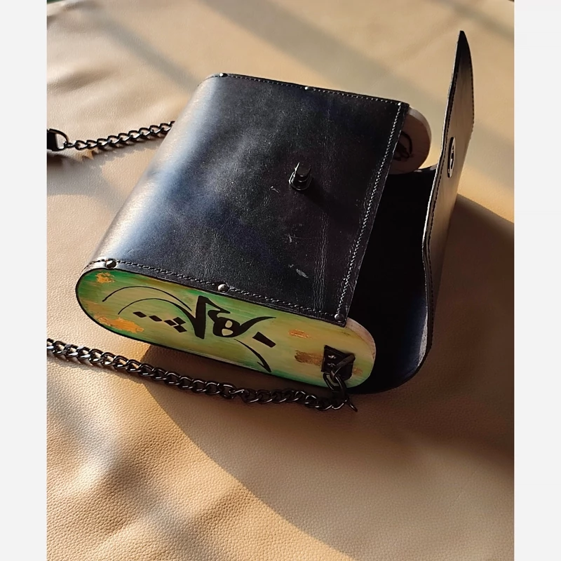 کیف رودوشی زنانه طرح هیچ سما چرم طبیعی گاوی درجه یک تماما دستدوز است که در کناره کیف از چوب نراد طراحی شده توسط تیم چرم خلاق استفاده شده که روی چوب ها نقاشی دست با رنگ آکرولیک کار شده و تمامی چوب ها دارای پوشش نانو ضد آب و خش است.