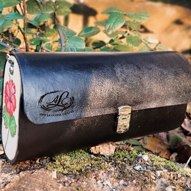 کیف دستی زنانه طرح گل ختمی با قابلیت اضافه کردن بند رودوشی چرم طبیعی گاوی درجه یک تماما دستدوز است که در کناره کیف از چوب نراد طراحی شده توسط تیم چرم خلاق استفاده شده که روی چوب ها نقاشی دست با رنگ آکرولیک کار شده و تمامی چوب ها دارای پوشش نانو ضد آب و خش است.