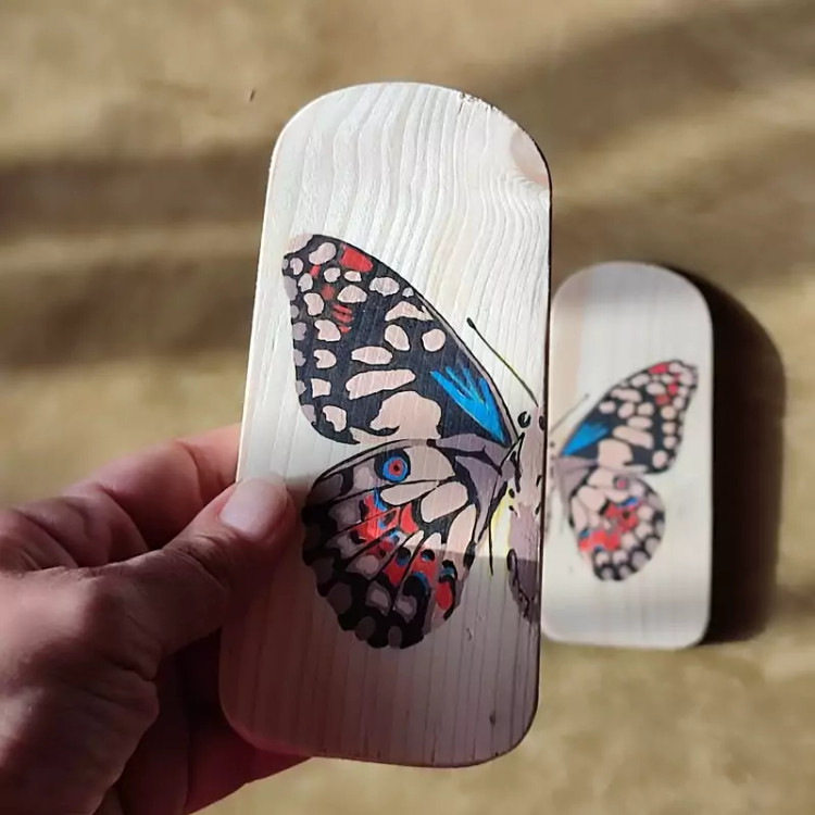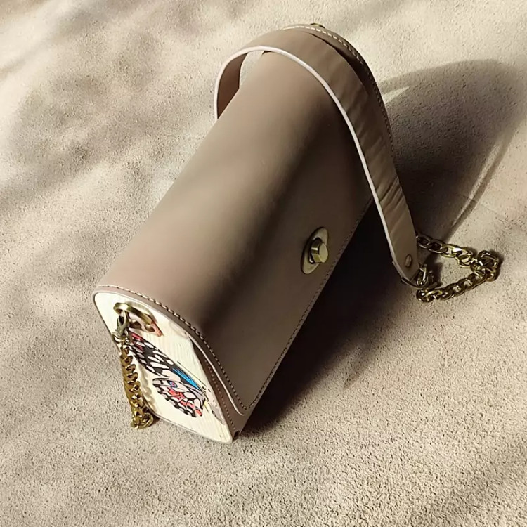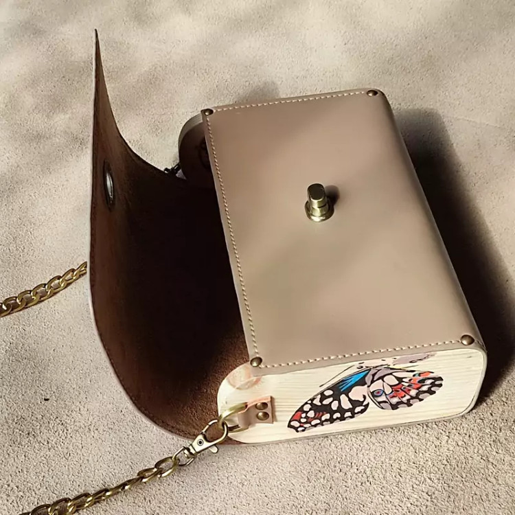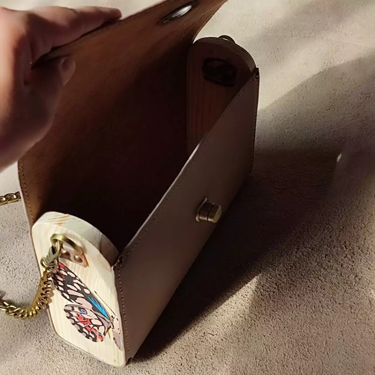 کیف رودوشی زنانه طرح پروانه چرم طبیعی گاوی درجه یک تماما دستدوز است که در کناره کیف از چوب نراد طراحی شده توسط تیم چرم خلاق استفاده شده که روی چوب ها نقاشی دست با رنگ آکرولیک کار شده و تمامی چوب ها دارای پوشش نانو ضد آب و خش است.