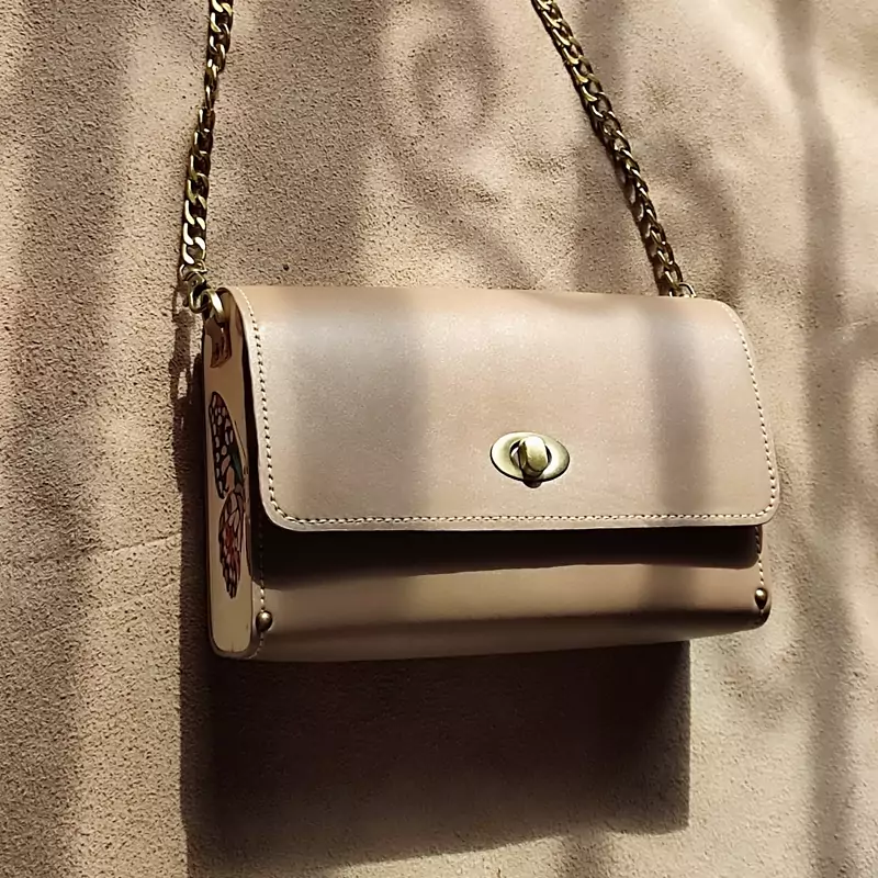 کیف رودوشی زنانه طرح پروانه چرم طبیعی گاوی درجه یک تماما دستدوز است که در کناره کیف از چوب نراد طراحی شده توسط تیم چرم خلاق استفاده شده که روی چوب ها نقاشی دست با رنگ آکرولیک کار شده و تمامی چوب ها دارای پوشش نانو ضد آب و خش است.