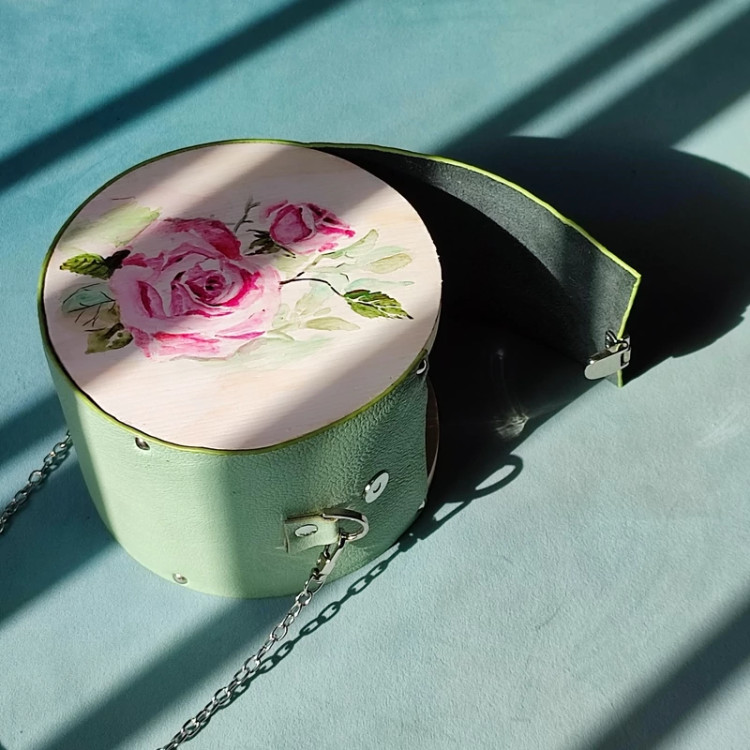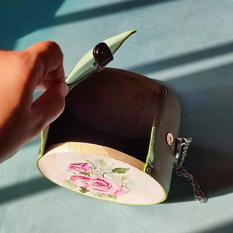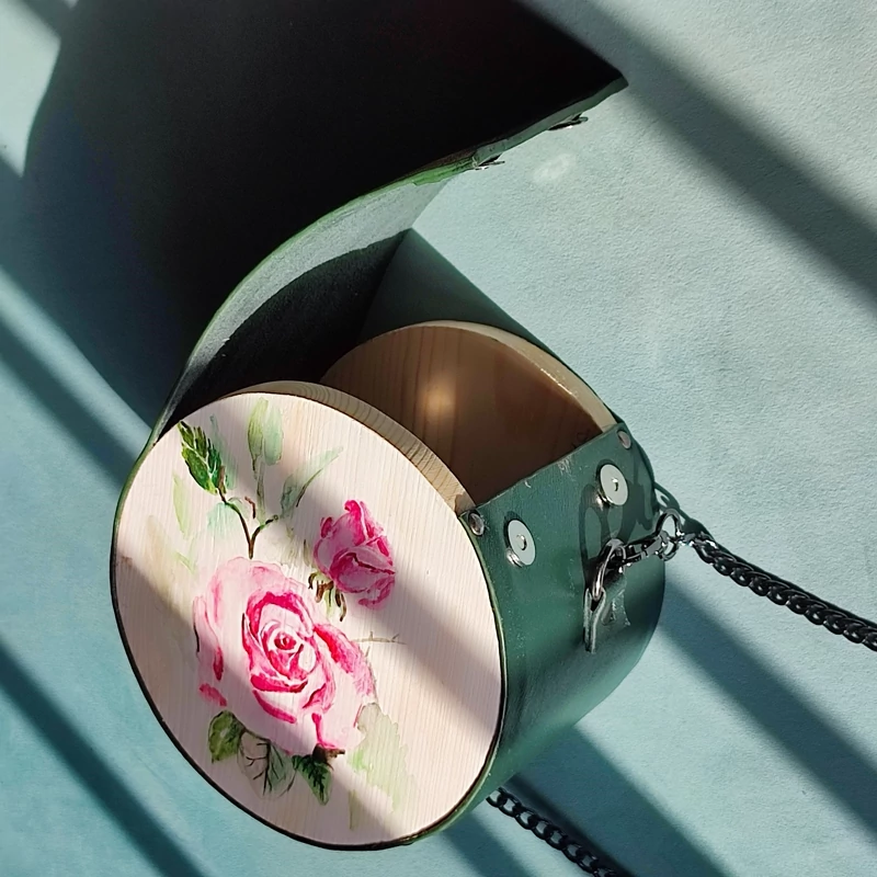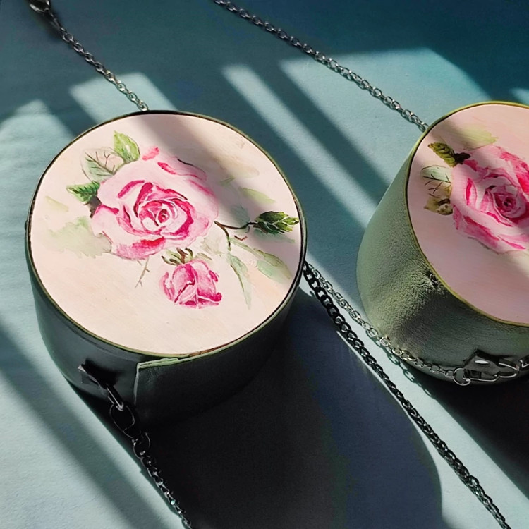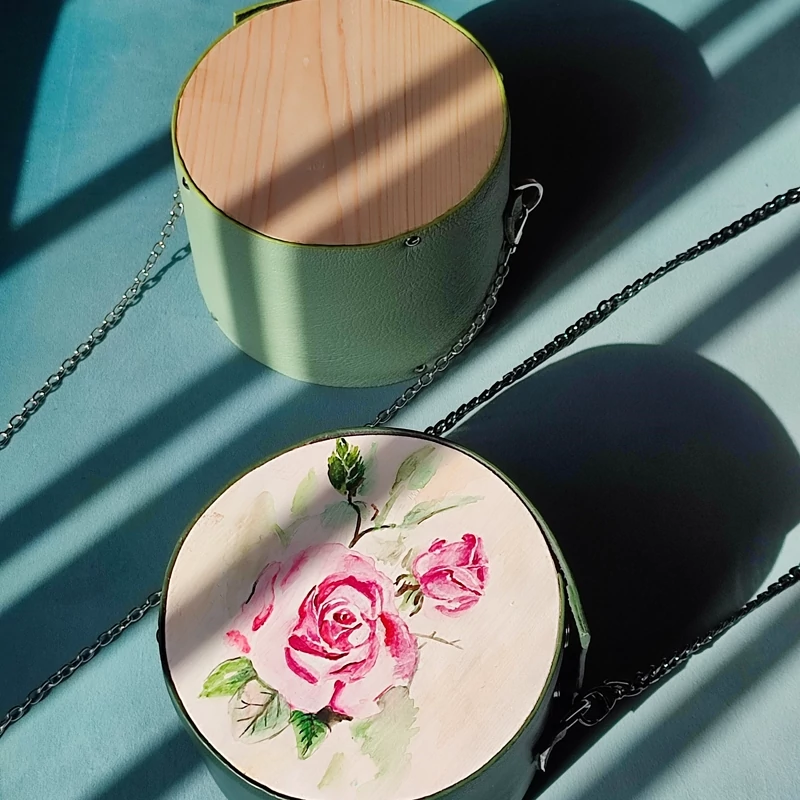 کیف رودوشی زنانه طرح گل رز چرم طبیعی گاوی درجه یک تماما دستدوز است که در کناره کیف از چوب نراد طراحی شده توسط تیم چرم خلاق استفاده شده که روی چوب ها نقاشی دست با رنگ آکرولیک کار شده و تمامی چوب ها دارای پوشش نانو ضد آب و خش است.