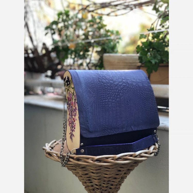 کیف رودوشی طرح اقاقیا چرم طبیعی گاوی درجه یک تماما دستدوز است که در کناره کیف از چوب نراد طراحی شده توسط تیم چرم خلاق استفاده شده که روی چوب ها نقاشی دست با رنگ آکرولیک کار شده و تمامی چوب ها دارای پوشش نانو ضد آب و خش است.