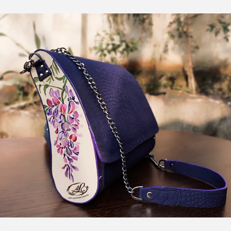 کیف رودوشی طرح اقاقیا چرم طبیعی گاوی درجه یک تماما دستدوز است که در کناره کیف از چوب نراد طراحی شده توسط تیم چرم خلاق استفاده شده که روی چوب ها نقاشی دست با رنگ آکرولیک کار شده و تمامی چوب ها دارای پوشش نانو ضد آب و خش است.